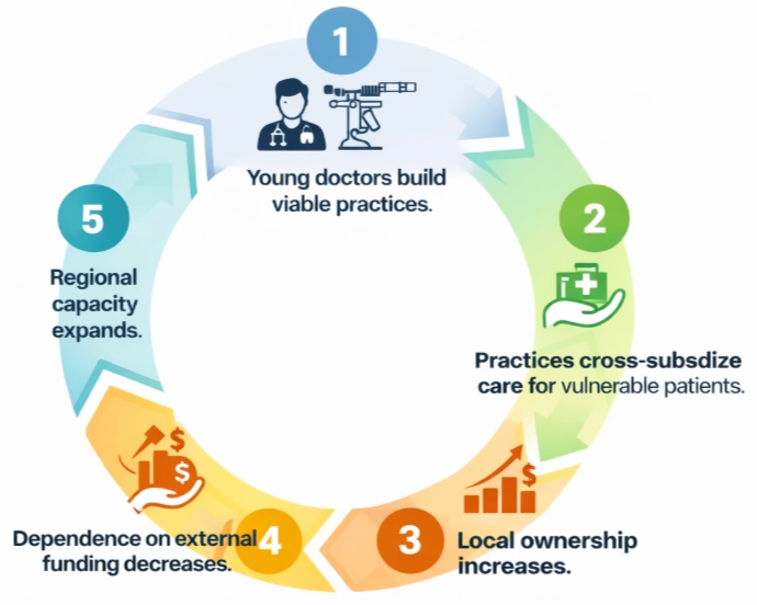 The long-term solution to blindness in Tanzania is not short-term intervention. It is workforce development. After residency training at Eye Corps facilities, young ophthalmologists receive mentorship, surgical instruments, and outreach coordination as they establish practices in underserved regions. By year five, these physicians achieve practice self-sustainability, gaining an invaluable entrepreneurial skillset. At that point, philanthropic dollars shift primarily toward outreach camps serving the poorest patients.